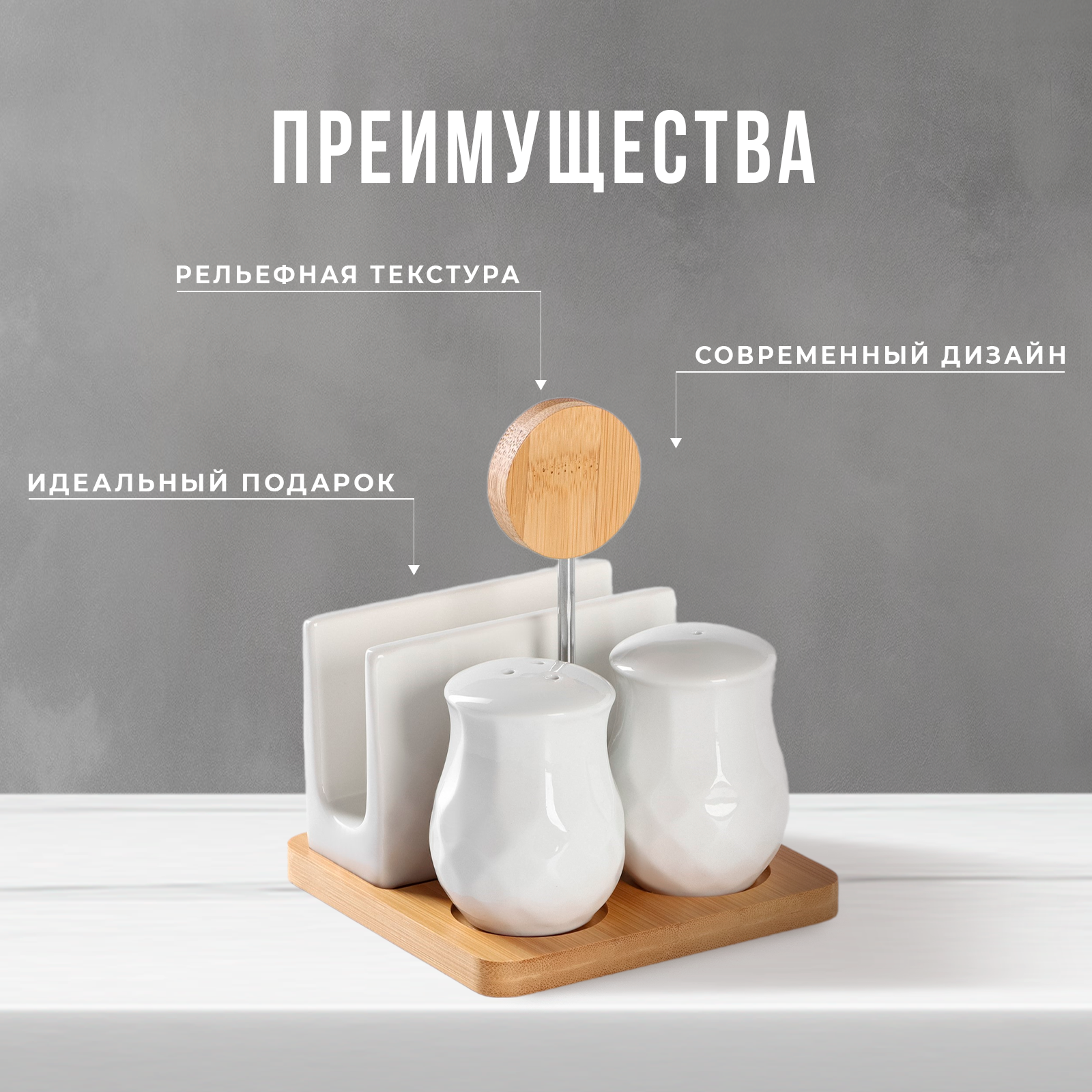 Набор фарфоровый для специй на деревянной подставке Доляна «Эстет», 4 предмета: солонка 110 мл, перечница 110 мл, салфетница, подставка цвет белый