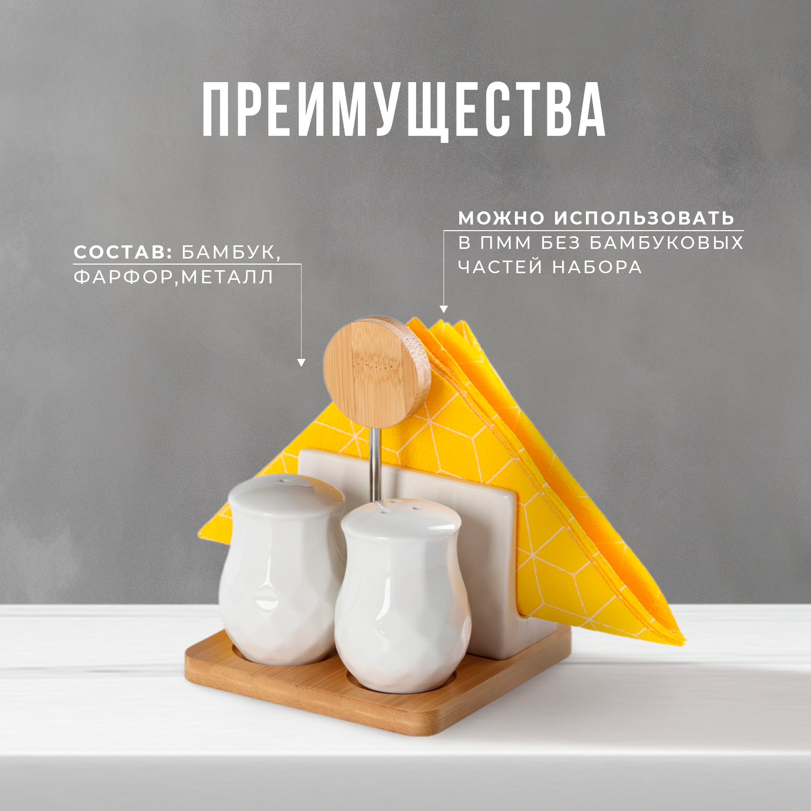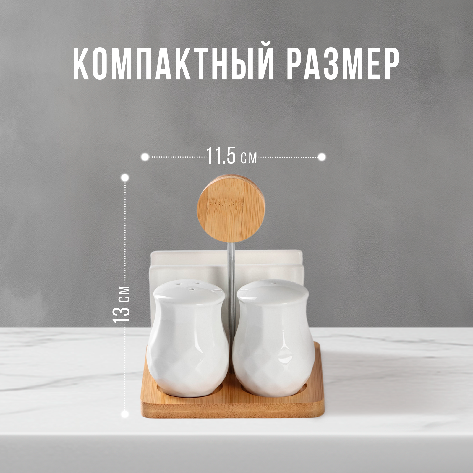 Набор для специй 4 предмета: солонка 110 мл, перечница 110 мл, салфетница, на бамбуковой подставке, фарфор, белый 959 ₽