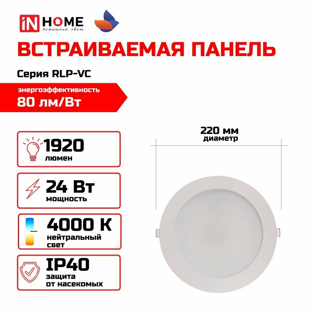 IN HOME Светильник потолочный RLP-VC, 24Вт, 4000К, встраиваемый, 1920 Лм, 220м, IP40 информация:
