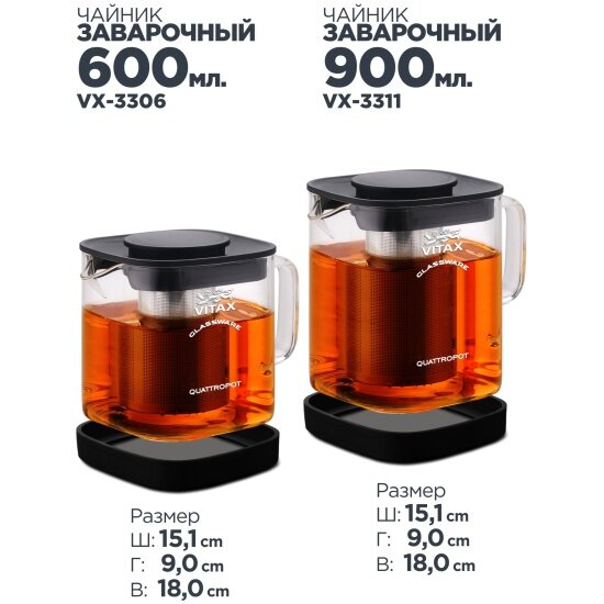 | Комплектация | Чайник заварочный 4в1 VITAX Thirlwall 900мл термостекло, пластик, нерж. сталь, силикон |