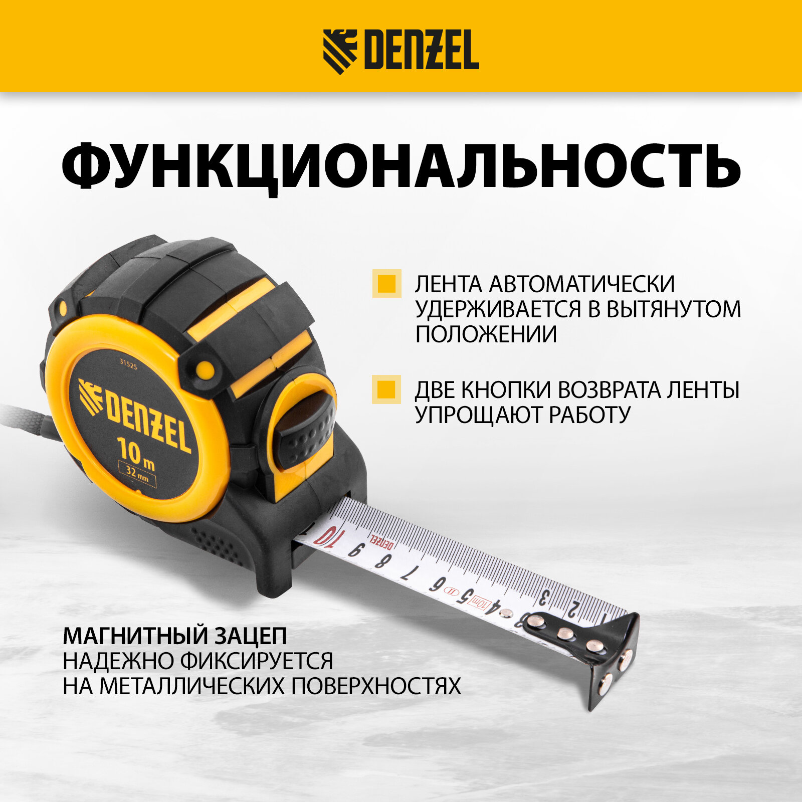 Рулетка Denzel 10м х 32ммавтоматич. фиксац, нейлон. покрытие, магнит. зацеп, двухстор. разметка 31525 информация: