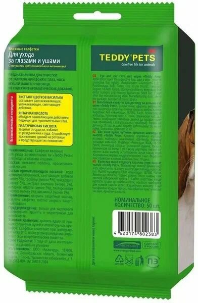 Влажные салфетки для ухода за глазами и ушами животных Teddy Pets , с васильком, 50 шт информация: