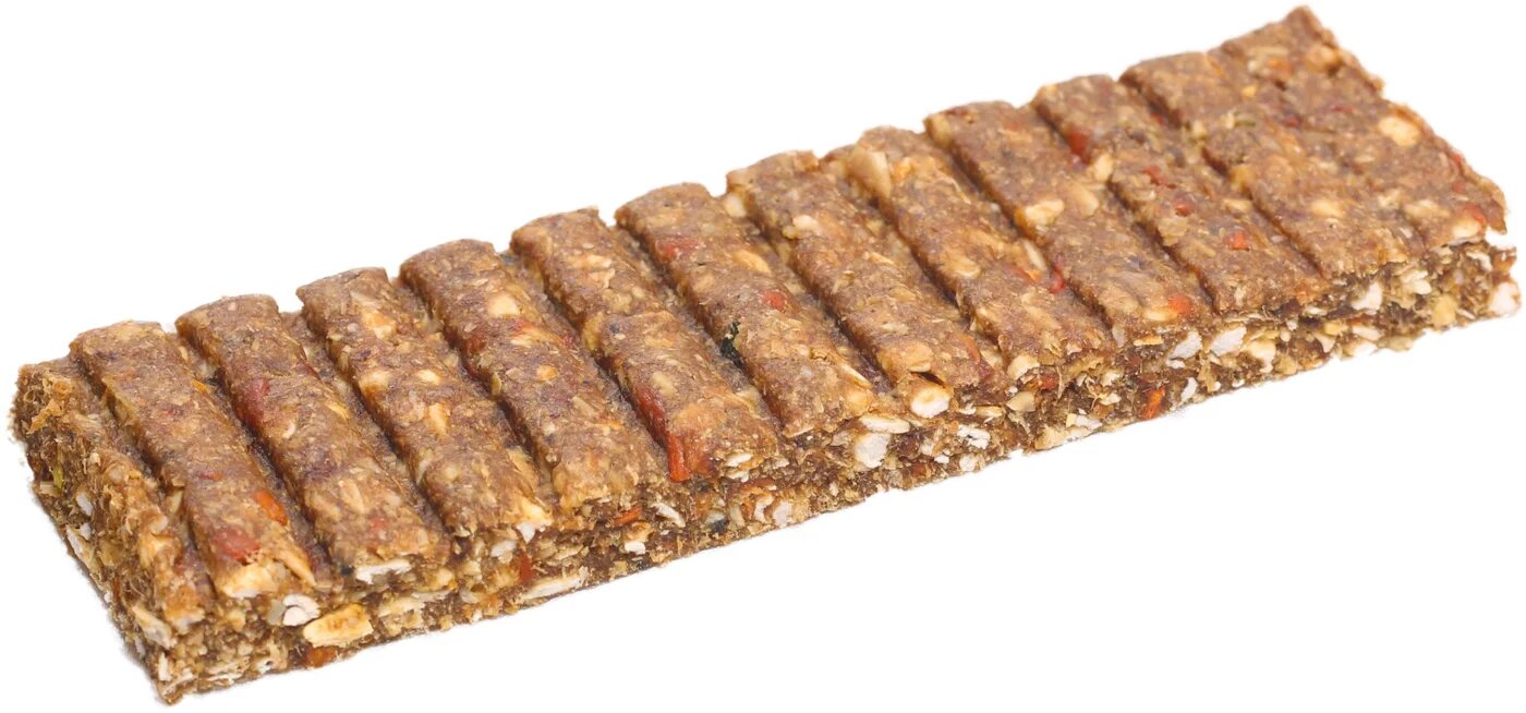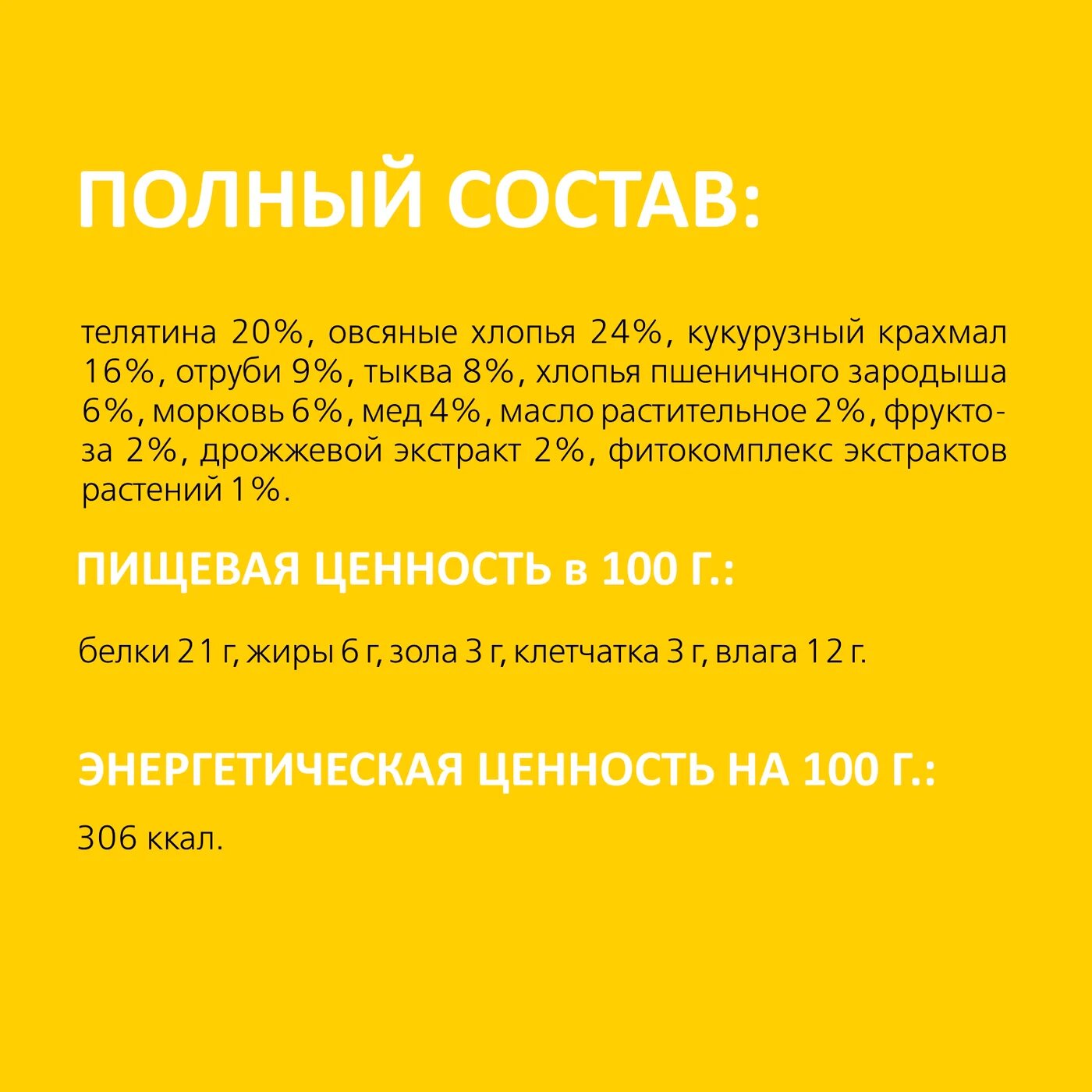 | Состав | Овсяные хлопья 24%, телятина 20%, кукурузный крахмал 16%, отруби 9%, тыква 8%, хлопья пшен. зарод. 6%, морковь 6%, мед 4%, масло растительное 2%, фруктоза 2%, дрожжевой экстракт 2%, фитокомплекс экстрактов растений 1%. |