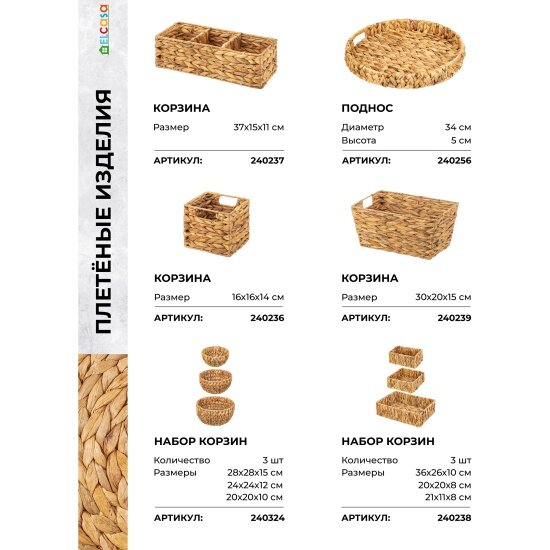 | Дополнительная информация | Набор 3 плетеных корзинок 38*23*20 см с ручками, 1 корзинка - 38*23*20 см, 1 корзинка - 34*19*19 см, 1 корзинка - 30*15*17 см |