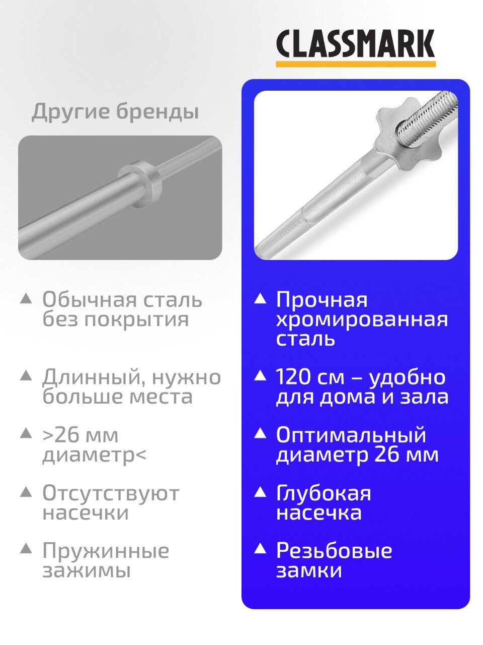 Отзывы на Гриф для штанги Classmark, прямой, 120 см, железный, серебристый