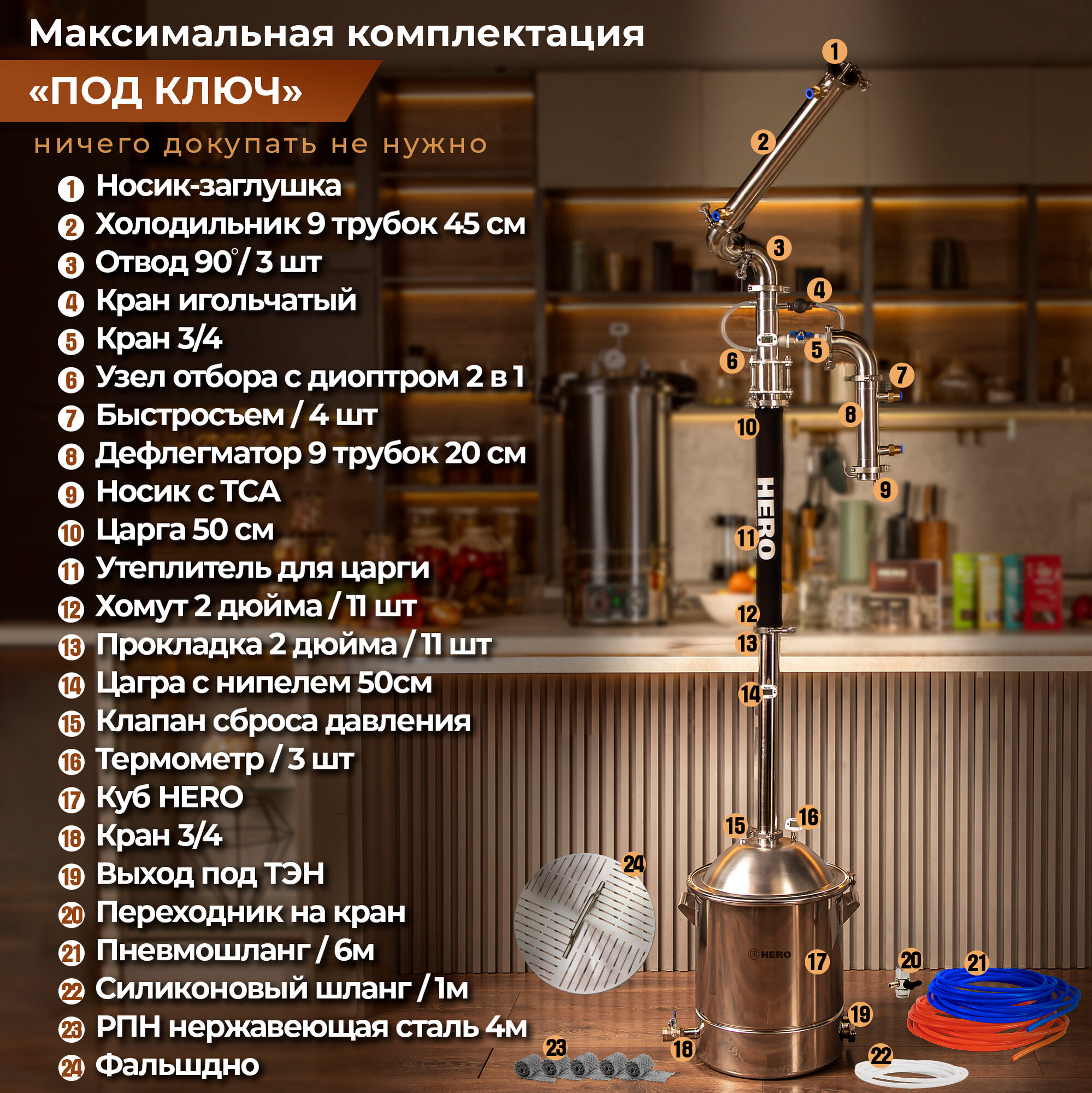 10 цен на Самогонный аппарат HERO (Хиро) 37 литров, бражная колонна 2 дюйма с узлом отбора 2в1 по пару и жидкости