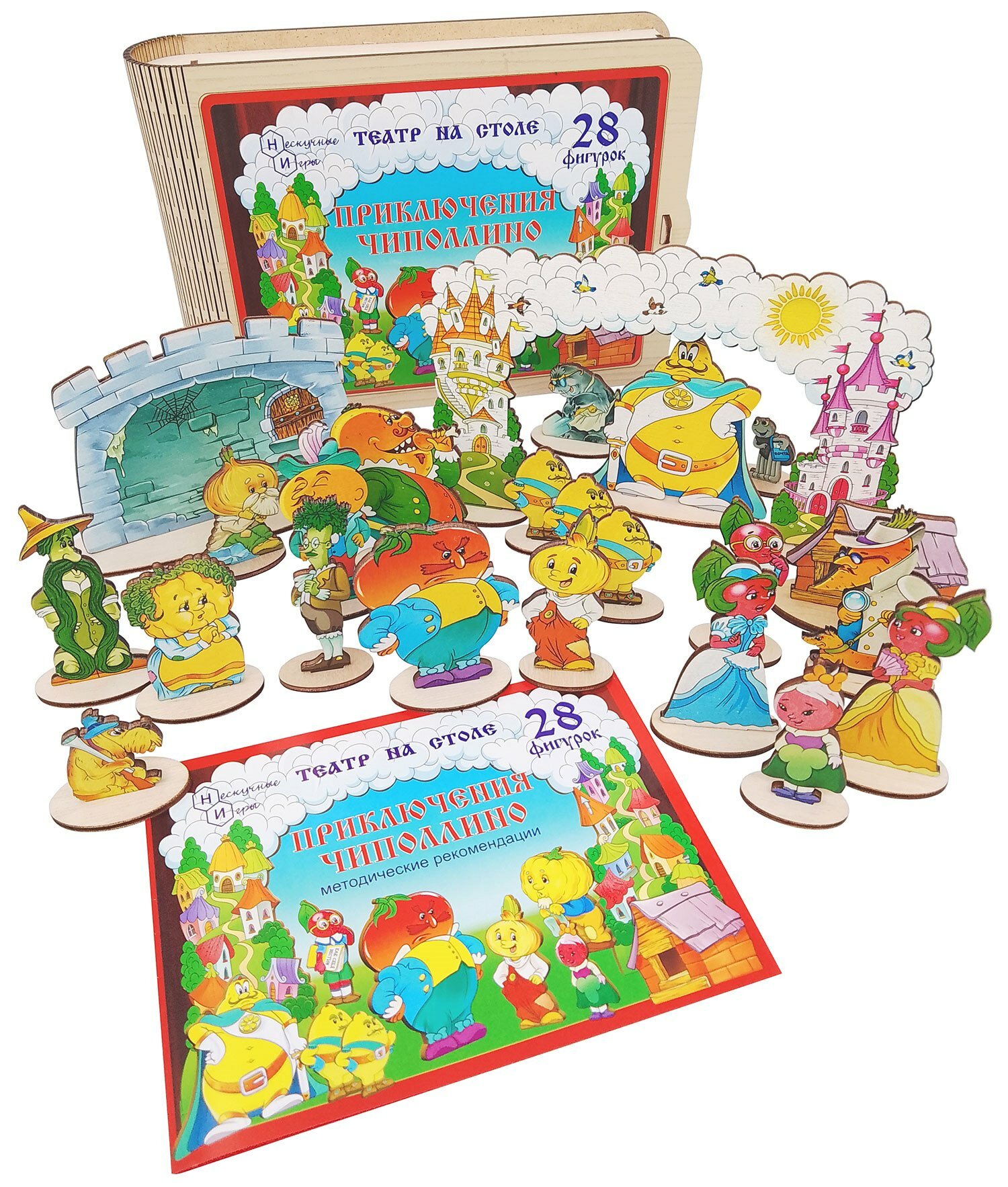 Настольный кукольный театр "Чиполлино" из дерева, детский набор для сюжетно-ролевой игры по сказке, в комплекте 28 фигурок на подставках и брошюра