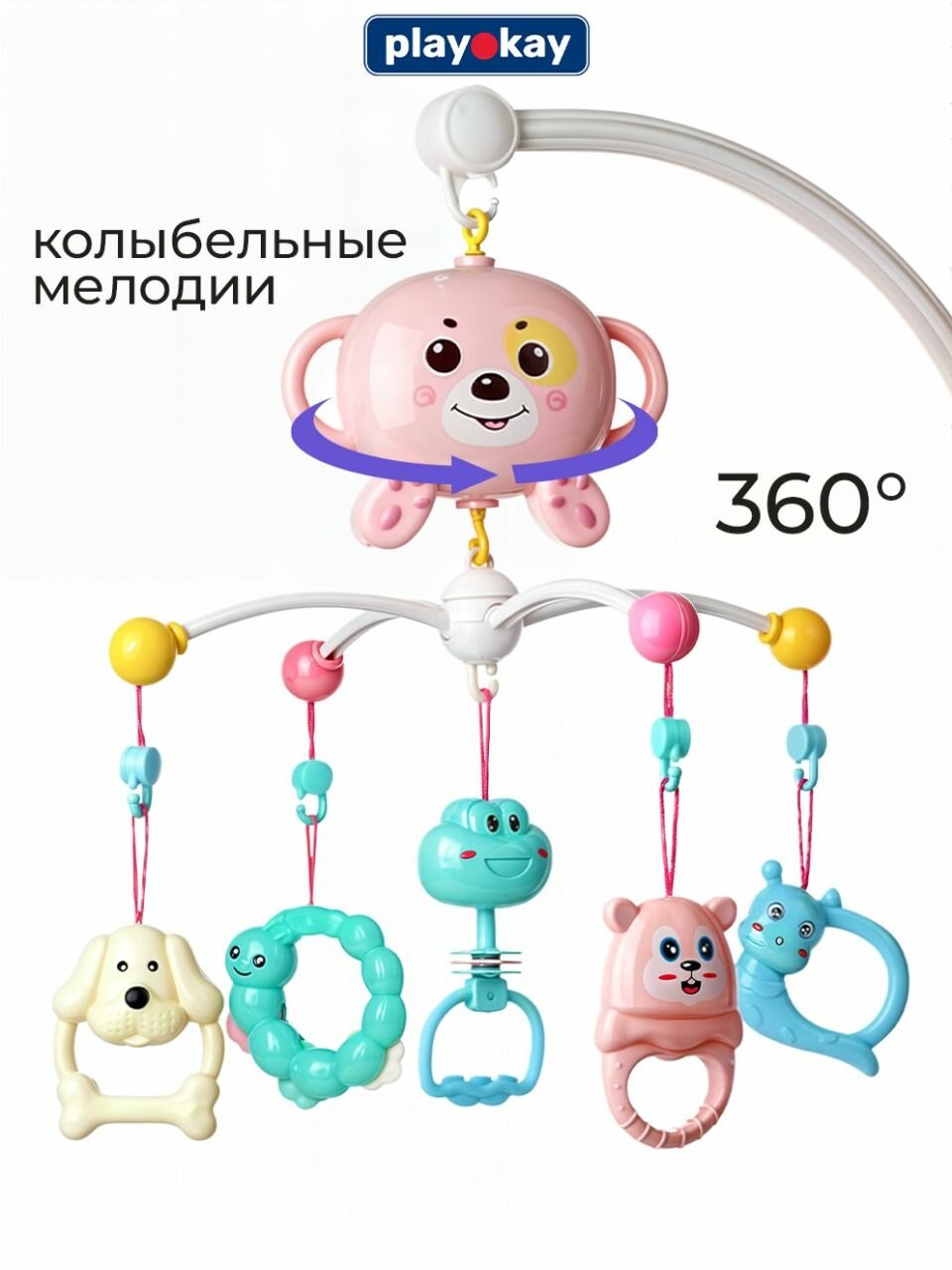 10 цен на Детский мобиль на кроватку для новорожденных музыкальный Play Okay, блок с игрушками и регулировкой громкости, карусель успокаивающая малыша - Розовый