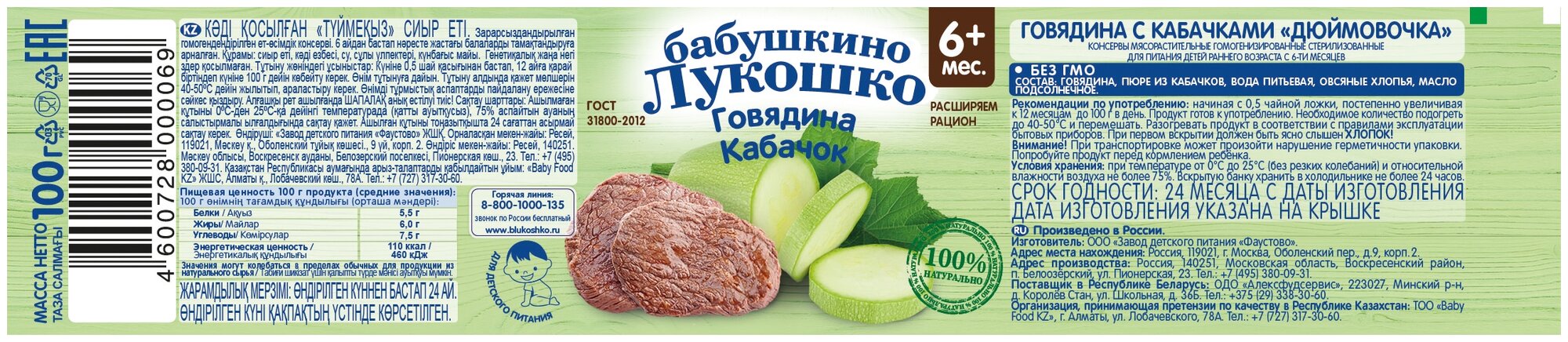 Бабушкино Лукошко говядина-кабачок, с 6 месяцев, 100 г, 6 шт. информация: