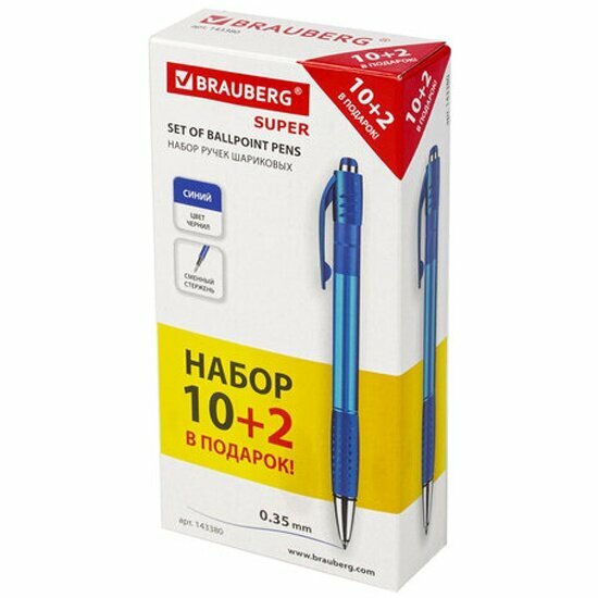 Отзывы на Набор шариковых ручек Brauberg "SUPER" синие "10+2 В подарок!", автоматические с грипом, набор 12 шт