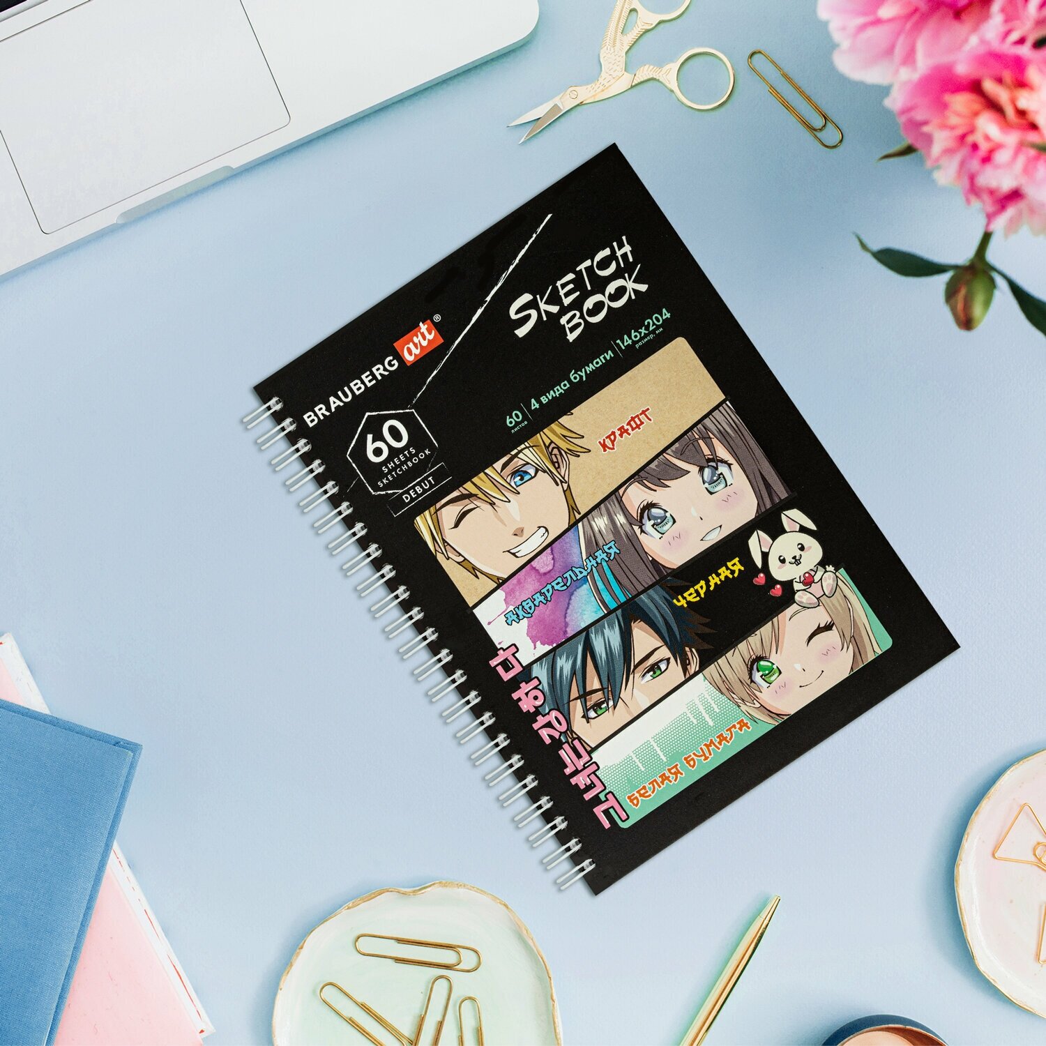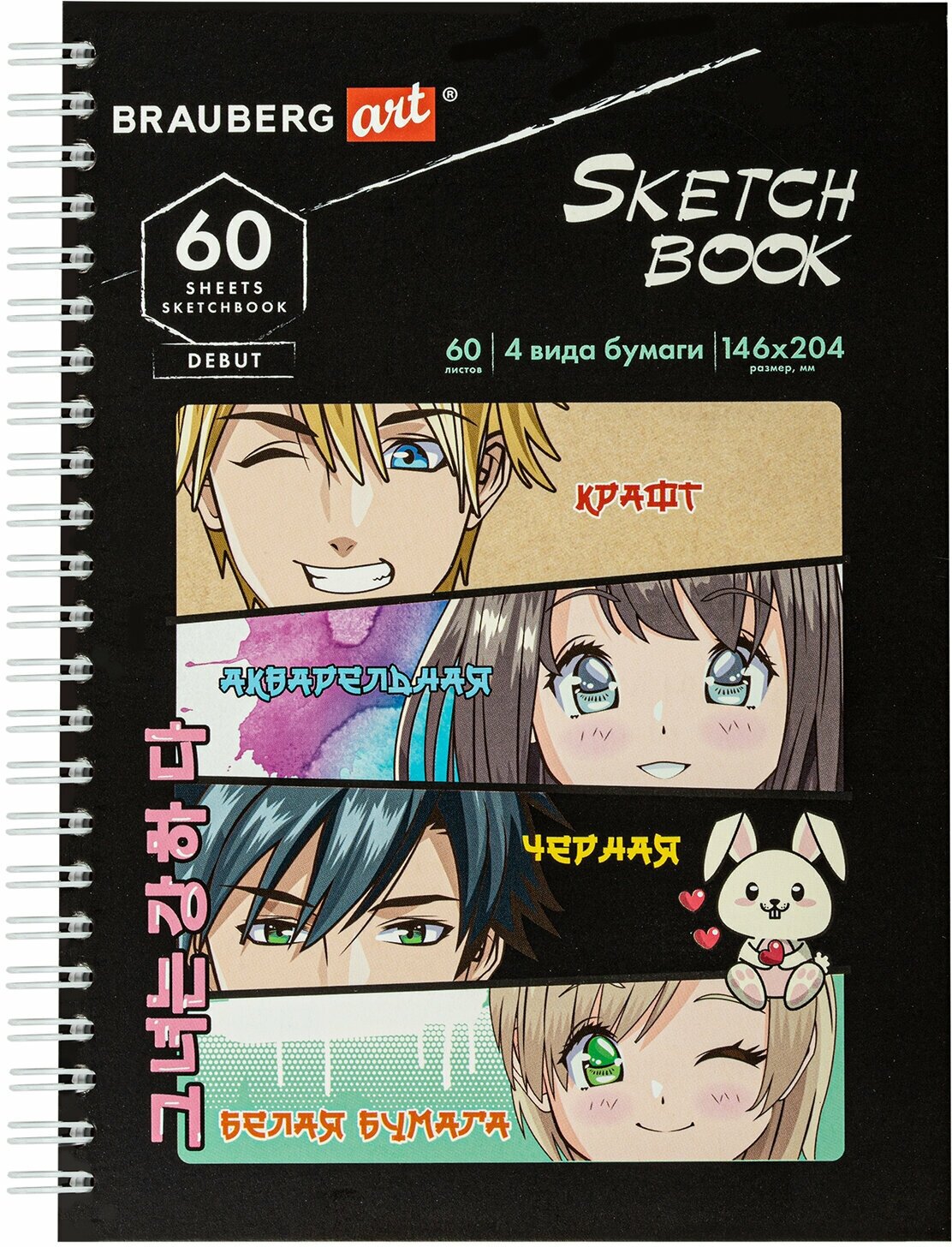 Скетчбук, 4 типа бумаги (акварельная, белая, черная, крафт) 146х204 мм, 60 л., гребень, BRAUBERG ART, аниме, 115066