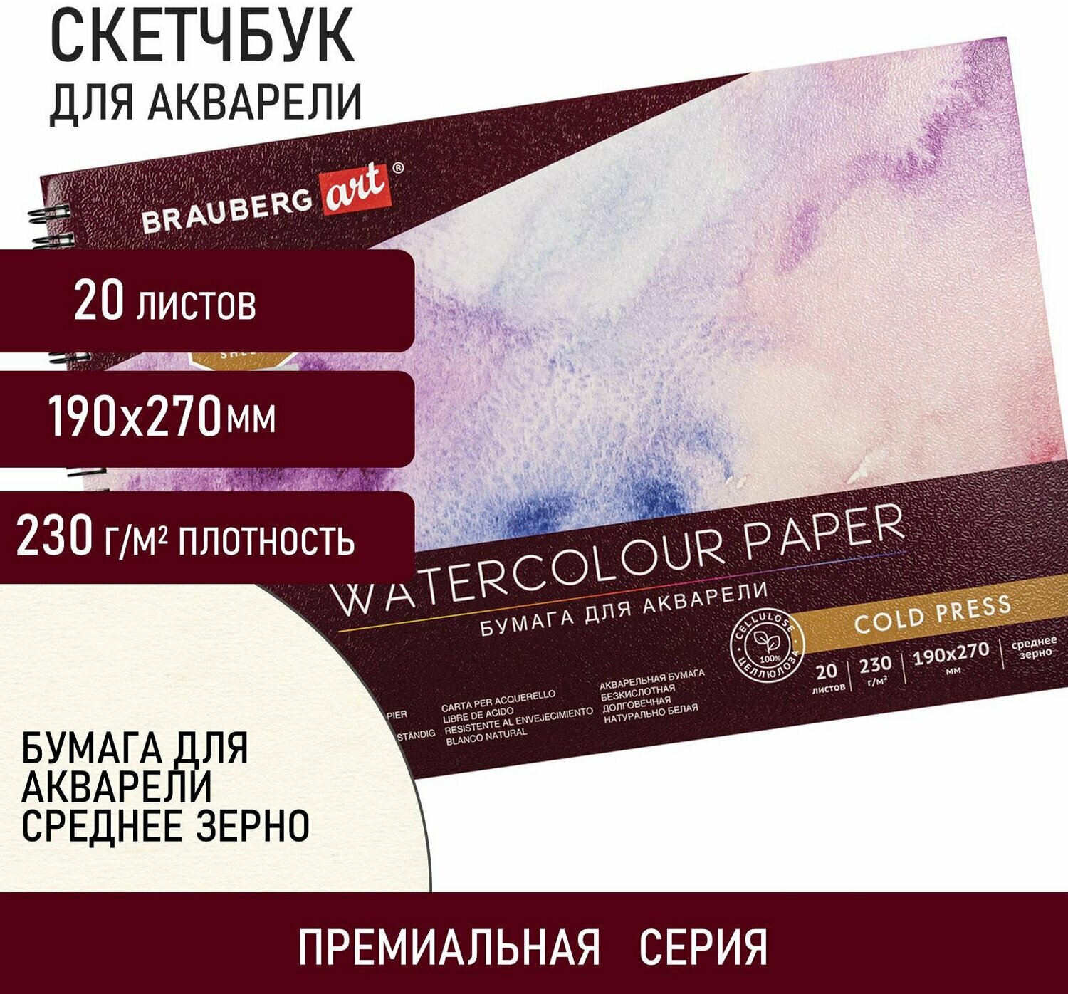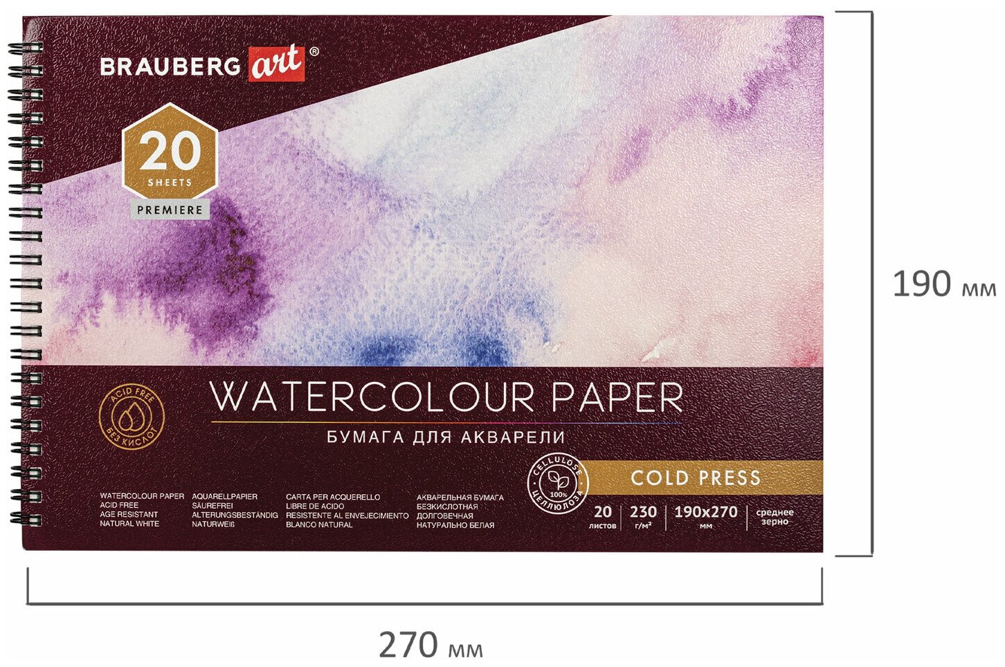 Альбом для акварели, бумага 230 г/м2, 190х270 мм, среднее зерно, 20 листов, гребень, BRAUBERG ART "PREMIERE"