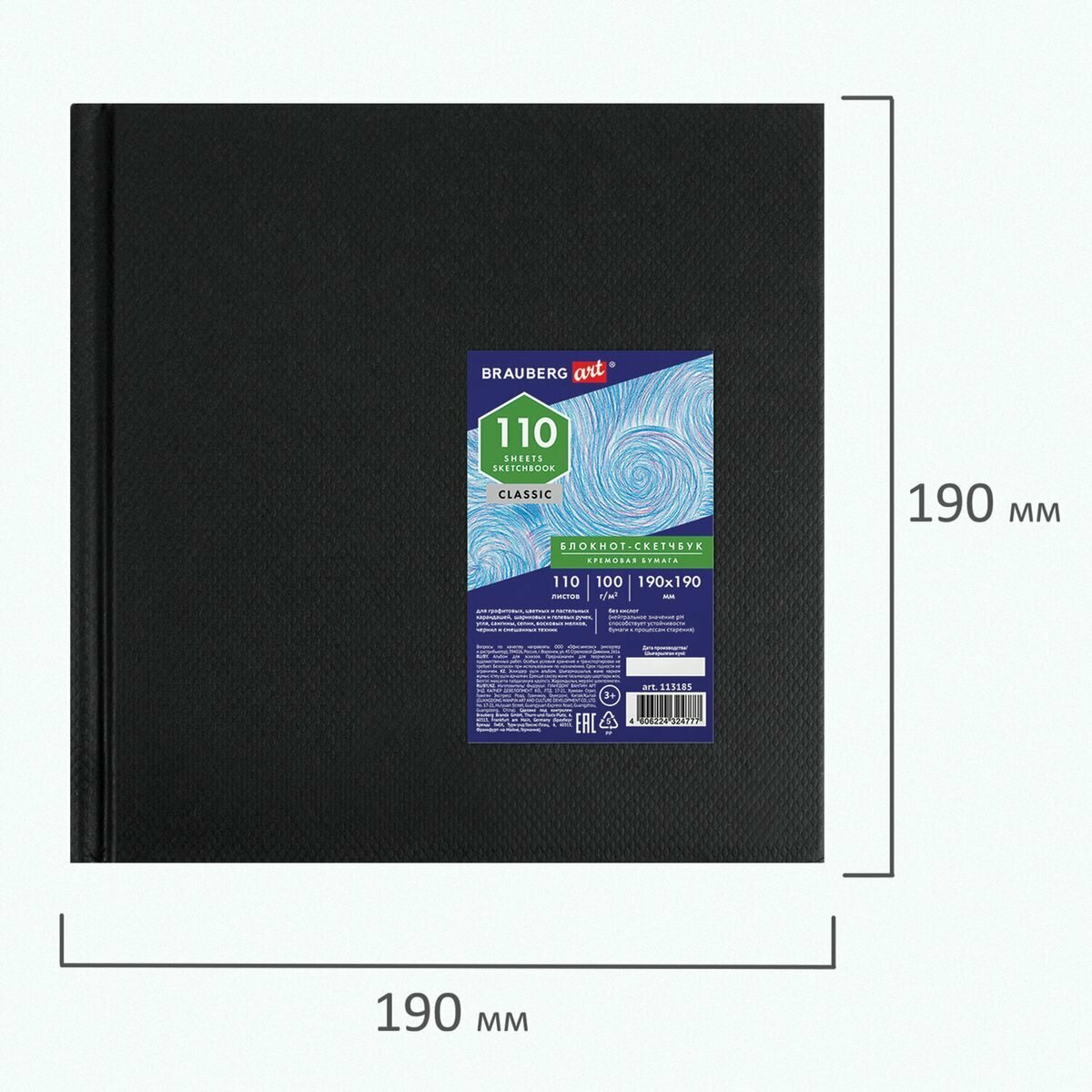 Блокнот-Скетчбук для рисования эскизов, страницы цвета слоновая кость 100 г/м2, 190х190 мм, 110 л, книжный твердый переплет, BRAUBERG ART CLASSIC, 113185