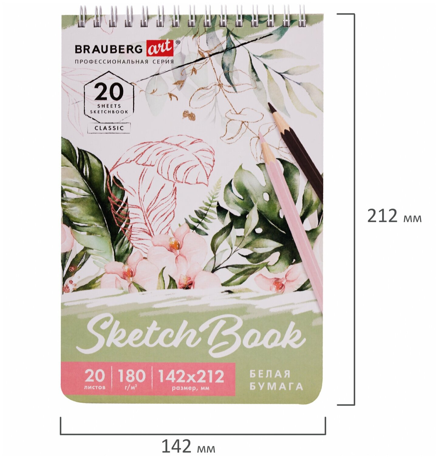 Блокнот-Скетчбук для рисования эскизов белая бумага 180 г/м2, 142х212 мм, 20 л, гребень, твердая обложка, Brauberg Art Classic, 112992 информация: