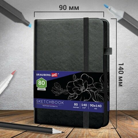 Скетчбук, черная бумага 140 г/м2, 90х140 мм, 80 л, кожзам, резинка, карман, BRAUBERG ART CLASSIC, черный, 113201 информация: