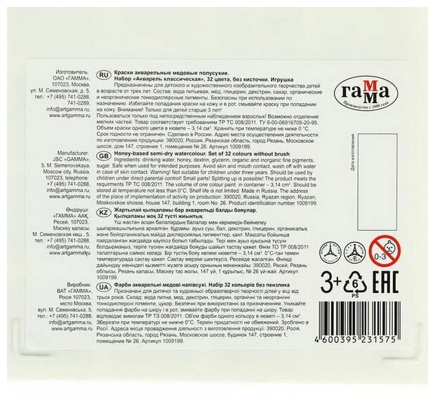 | Дополнительная информация | Комплектация: Акварельные краски 32 цветов |