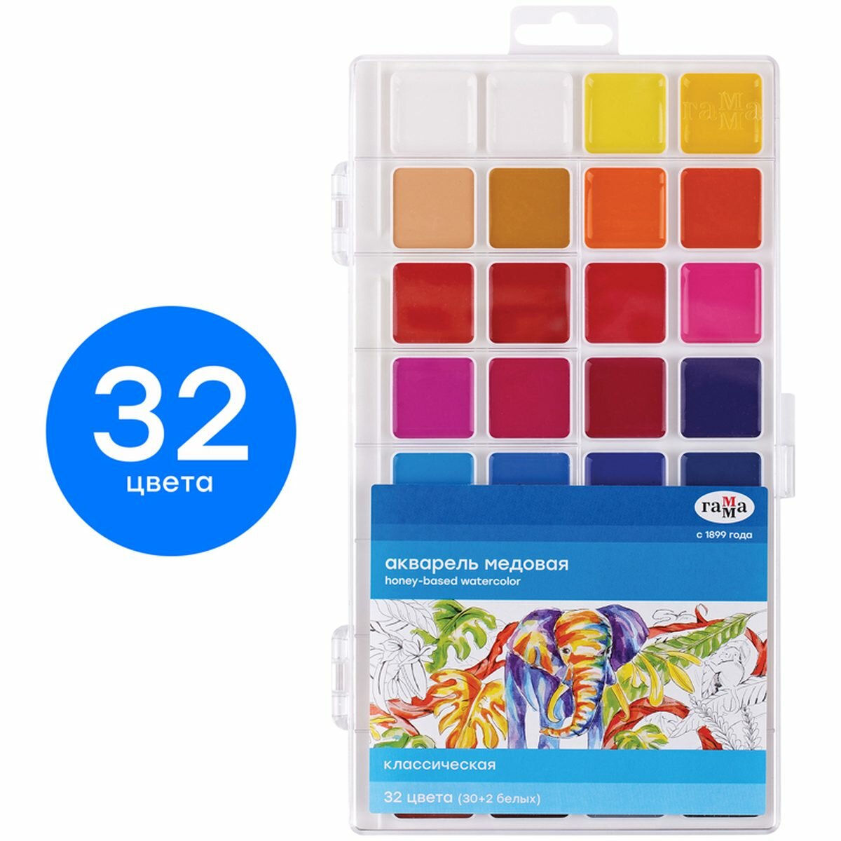 Краски акварельные медовые 32 цвета Гамма "Классическая", без кисти, пластик (1009199), 7 уп. информация: