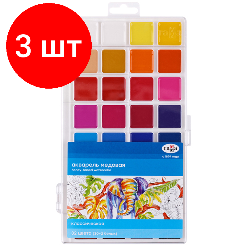 Комплект 3 шт, Акварель Гамма "Классическая", медовая, 32 цвета, без кисти, пластик. упак, европодвес информация: