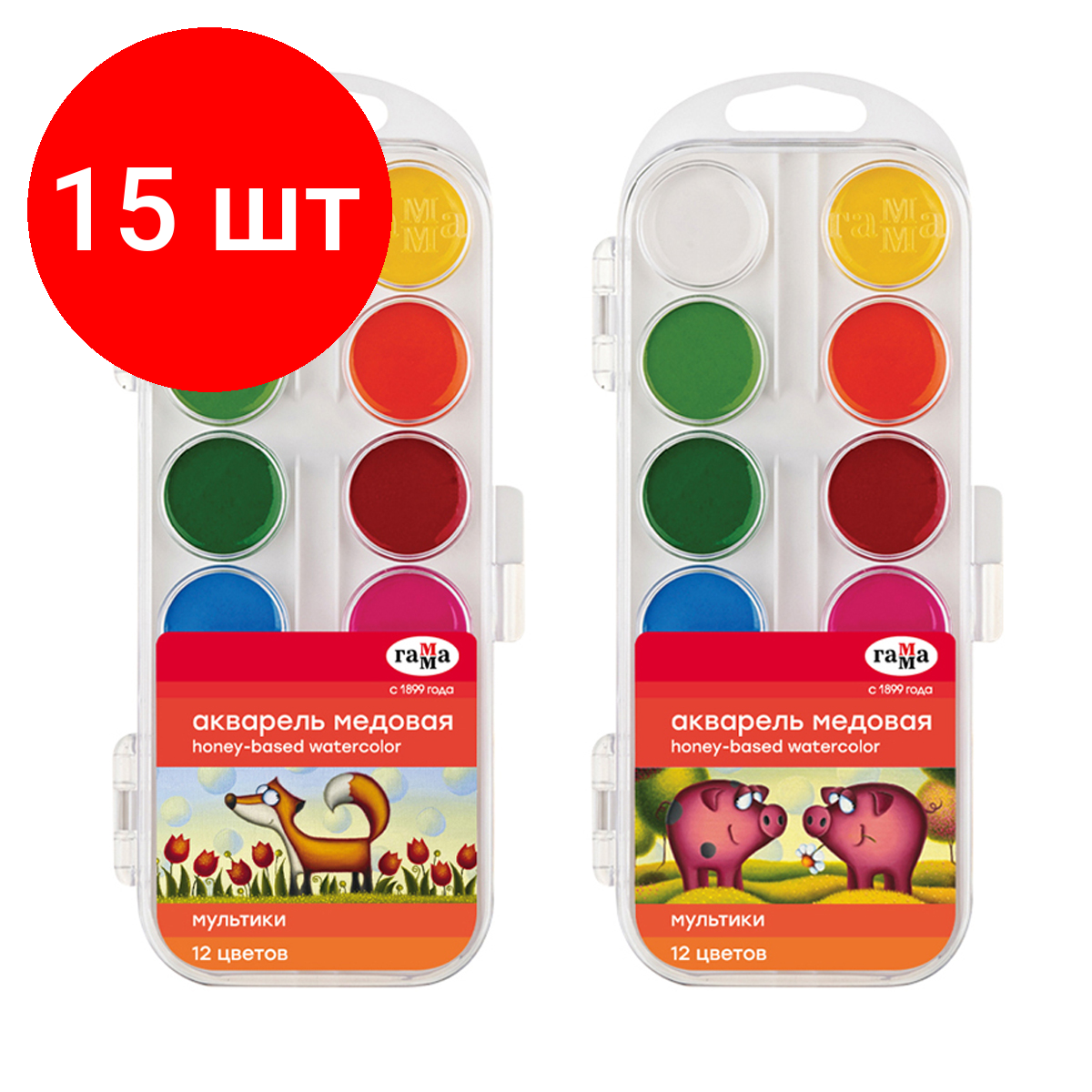 10 цен на Комплект 15 шт, Акварель Гамма "Мультики" NEW, медовая, 12 цветов, без кисти, пластик. упак, европодвес