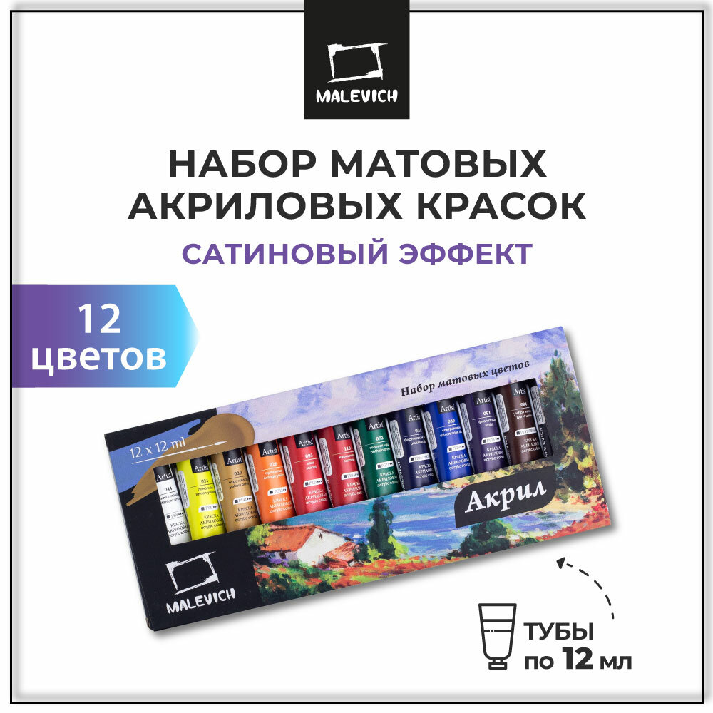 Набор матовых акриловых красок Малевичъ, сатиновый финиш, 12 цветов по 12 мл информация: