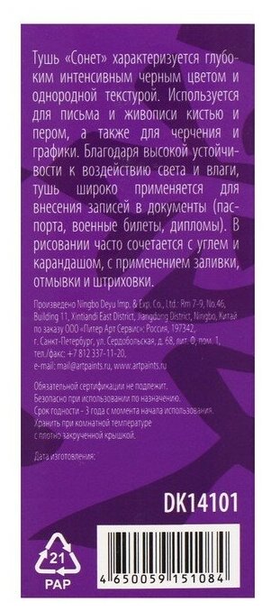 Тушь черная жидкая Сонет DK14101 пластиковая бутылка 100 г, цена за 1 шт. информация: