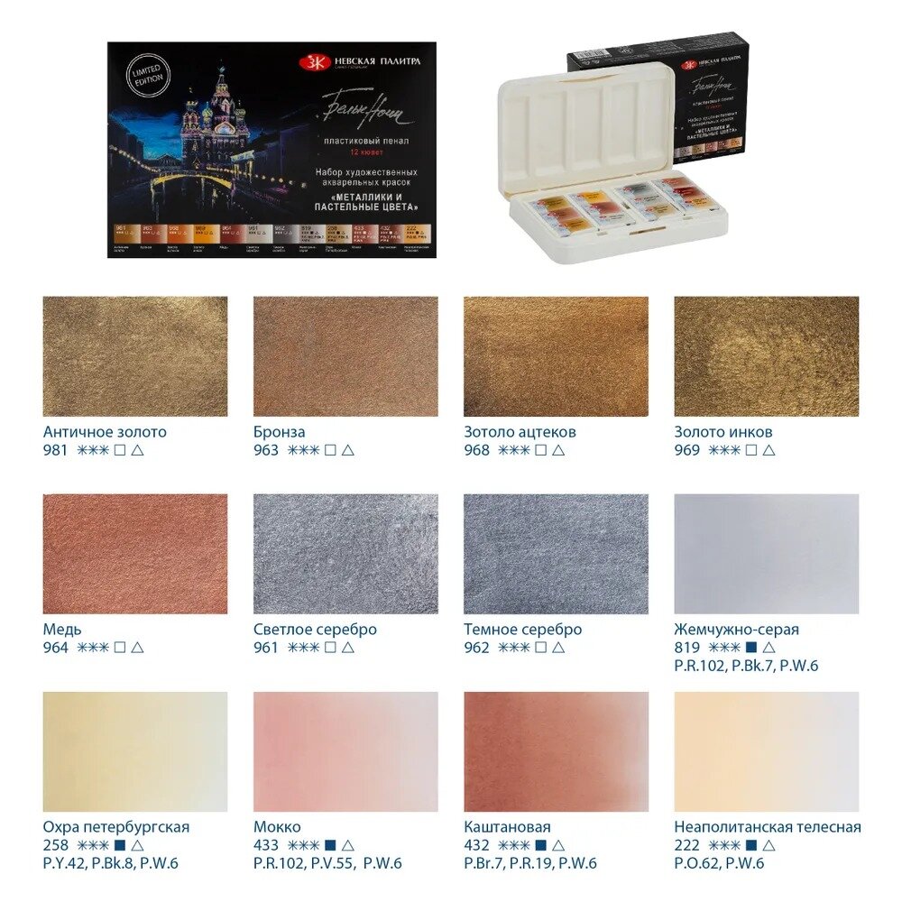 Невская Палитра Набор акварели "Белые Ночи", Металлики и пастельные цвета, 12 цветов в кюветах, пластик информация: