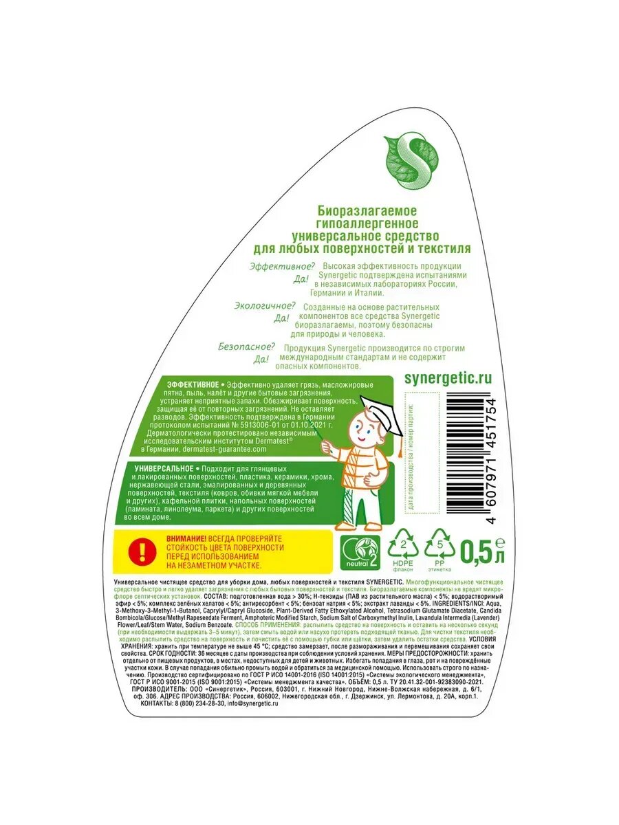 | Подробная комплектация | SYNERGETIC Универсальное чистящее средство для уборки дома, 500 мл - 1 штука |
