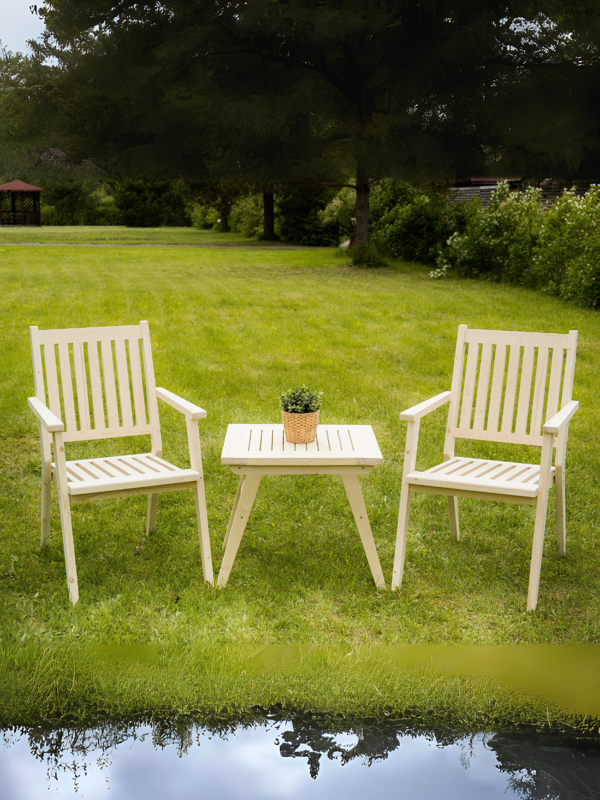 10 цен на Комплект садовой мебели из массива дерева (столик кофейный, 2 стула со спинкой) на 2 человека