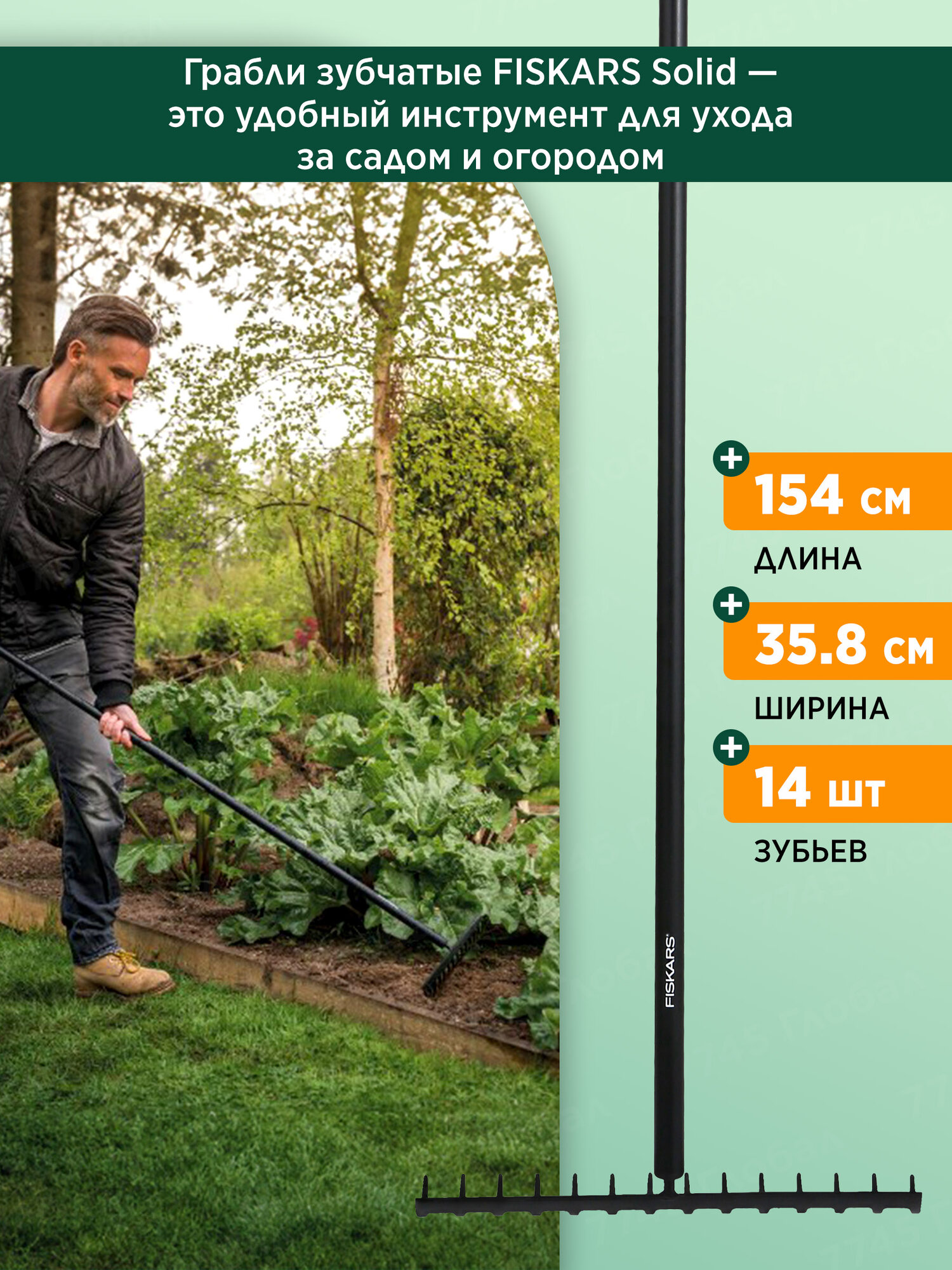 Грабли садовые зубчатые с черенком FISKARS Solid 135715 1016036, длина 154 см информация: