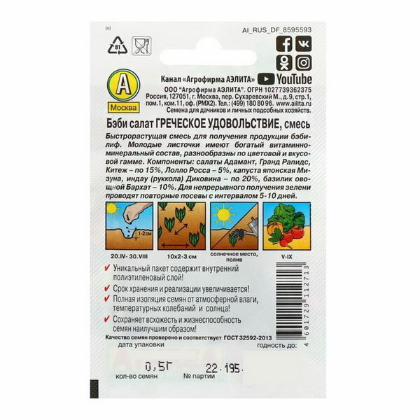 Семена Агрофирма АЭЛИТА Лидер Бэби салат Греческое удовольствие, смесь 0.5 г