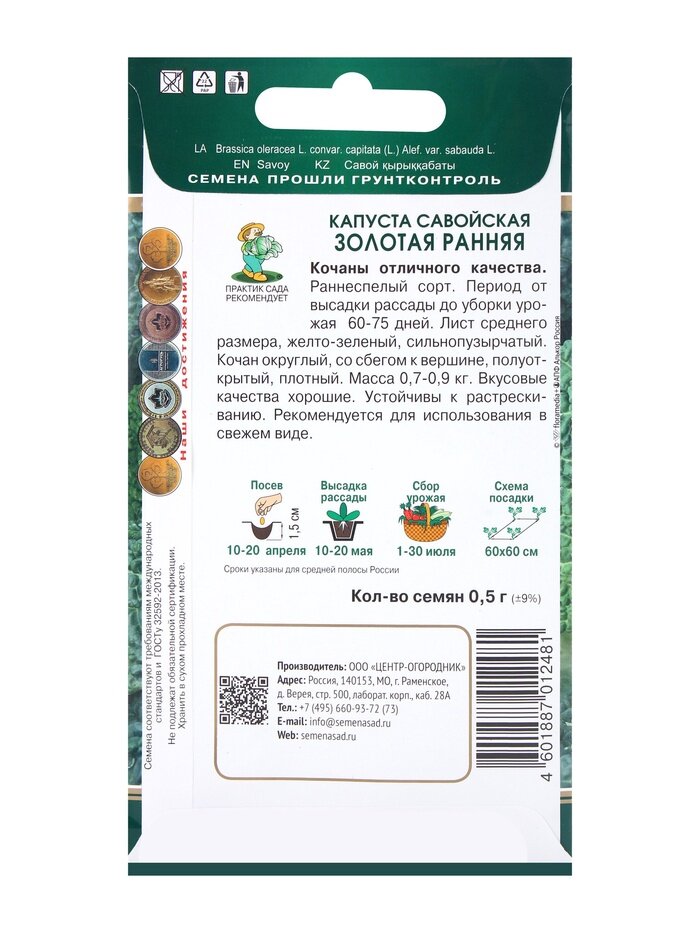 Семена Капуста савойская "Золотая ранняя", 0,5гр. информация: