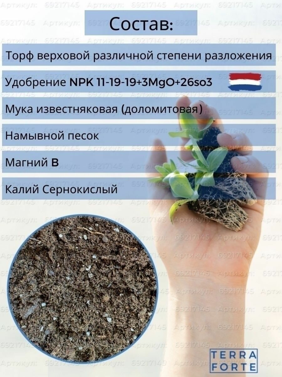 | Состав | торф верховой различной степени разложения; намывной песок; мука известняковая (доломитовая); удобрение минеральное Ван Иперен, марка водорастворимый NPK 11-19-19+3MgO+26SO3+микроэлементы; магний сернокислый марка B (сульфат магния); калий сернокислый (сульфат калия) |