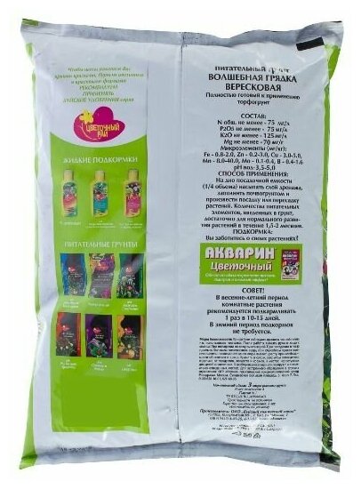 | Основные питательные вещества в мг/л, не менее | азот (N) – не менее 325 мг/л; фосфор (Р2О5) – не менее 325 мг/л; калий (К2О) – не менее 325 мг/л; микроэлементы - присутствуют; кислотность (рН) - 5,5-7,0. |
