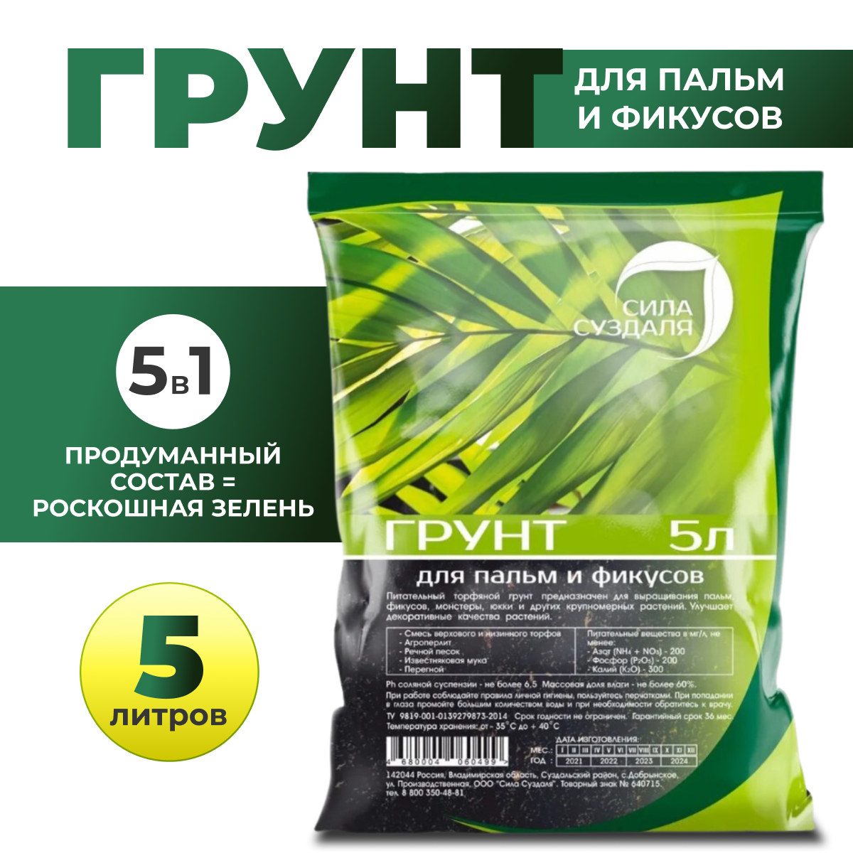 Грунт для фикуса и пальмы Сила Суздаля /земля для комнатных цветов, 5л информация:
