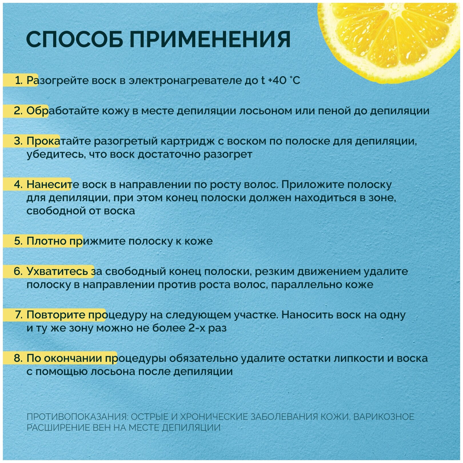 | Способ применения | разогрейте воск в электронагревателе до t +40°C. Обработайте кожу в месте депиляции лосьоном или пеной до депиляции. Не вынимая картридж из нагревателя, прокатайте разогретый картридж с воском по полоске для депиляции, убедитесь, что воск достаточно разогрет. На обработанный участок кожи нанесите воск в направлении по росту волос. Приложите полоску для депиляции, при этом конец полоски должен находиться в зоне, свободной от воска. Плотно прижмите полоску к коже. Ухватитесь за свободный конец полоски, резким движением удалите полоску в направлении против роста волос, параллельно коже. Повторите процедуру на следующем участке. Наносить воск на одну и ту же зону можно не более 2-х раз. По окончании процедуры обязательно удалите остатки липкости и воска с помощью лосьона после депиляции |