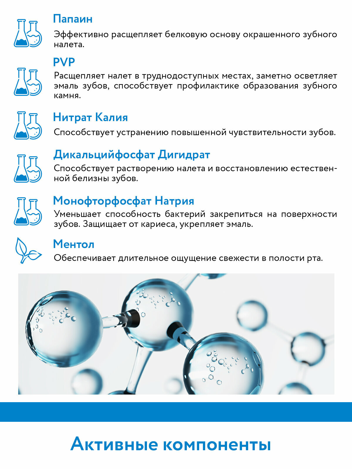 | Дополнительная информация | Папаин – эффективно расщепляет белковую основу окрашенного зубного налета. PVP – расщепляет налет в труднодоступных местах, заметно осветляет эмаль зубов, способствует профилактике образования зубного камня. Нитрат Калия – способствует устранению повышенной чувствительности зубов. Дикальцийфосфат Дигидрат – по своему составу близок к составу зубной эмали. За счет своей мягкой структуры бережно очищает зубной налет, не повреждая эмали. Регулирует рН полости рта, выполняет минерализирующую функцию за счет ионов кальция и фосфора. Монофторфосфат Натрия – уменьшает способность бактерий закрепиться на поверхности зубов. Защищает от кариеса, укрепляет эмаль. Ментол – обеспечивает длительное ощущение свежести в полости рта. |