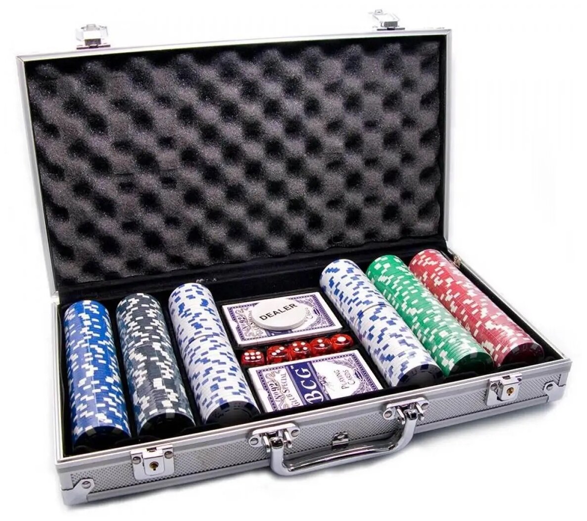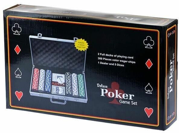 | В наборе | Карты материал: с пластиковым покрытием Количество фишек: 300 Номинал фишек: 10-100шт, 20-50шт, 50-50шт, 100-50шт, 500-50шт Карты: 2 колоды Кости: 5 костей Дополнительно: фишка дилера Кейс: металлический кейс + ключи |