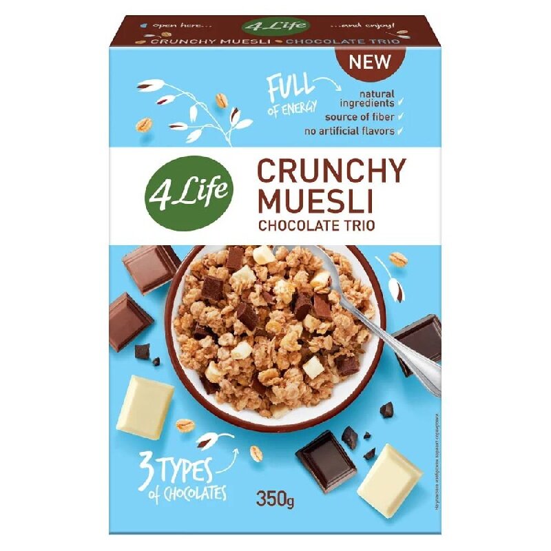 10 цен на Мюсли 4LIFE хрустящие Chocolate trio /картон/ 350г