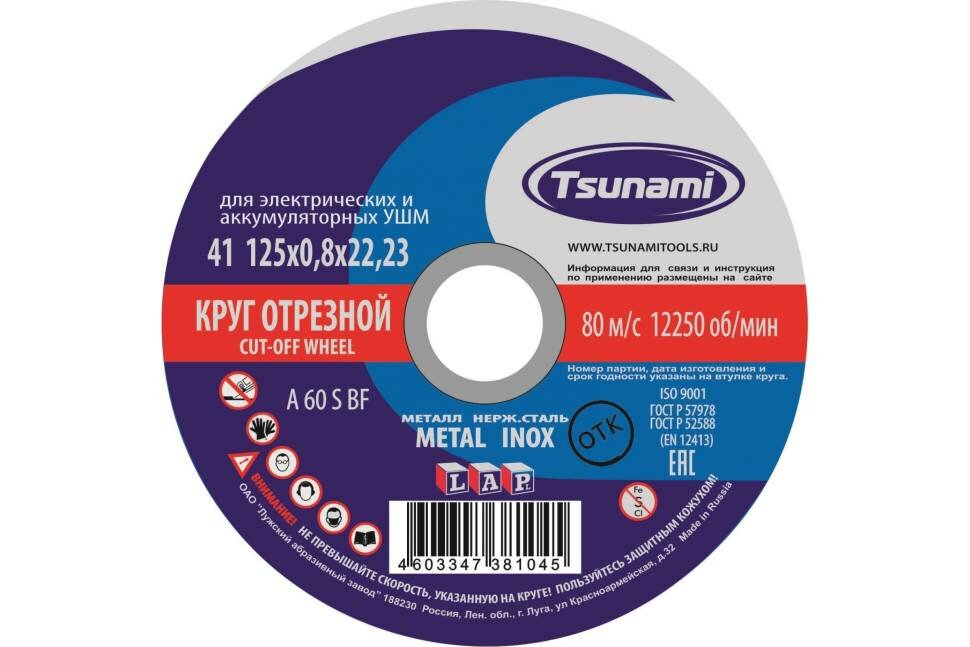 Круг отрезной по металлу и нержавеющей стали (125х0,8х22 A 60 S BF L) Tsunami D16101250822000 информация:
