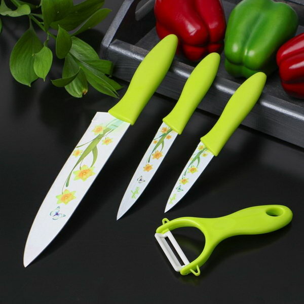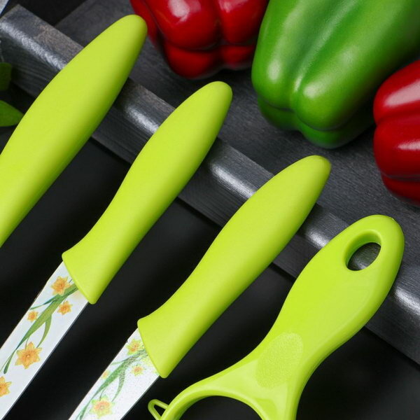 10 цен на Набор кухонных принадлежностей 4 предмета: 3 ножа с антиналипающим покрытием, лезвие 8.5 см, 12 см, 20 см, овощечистка, цвет зелёный