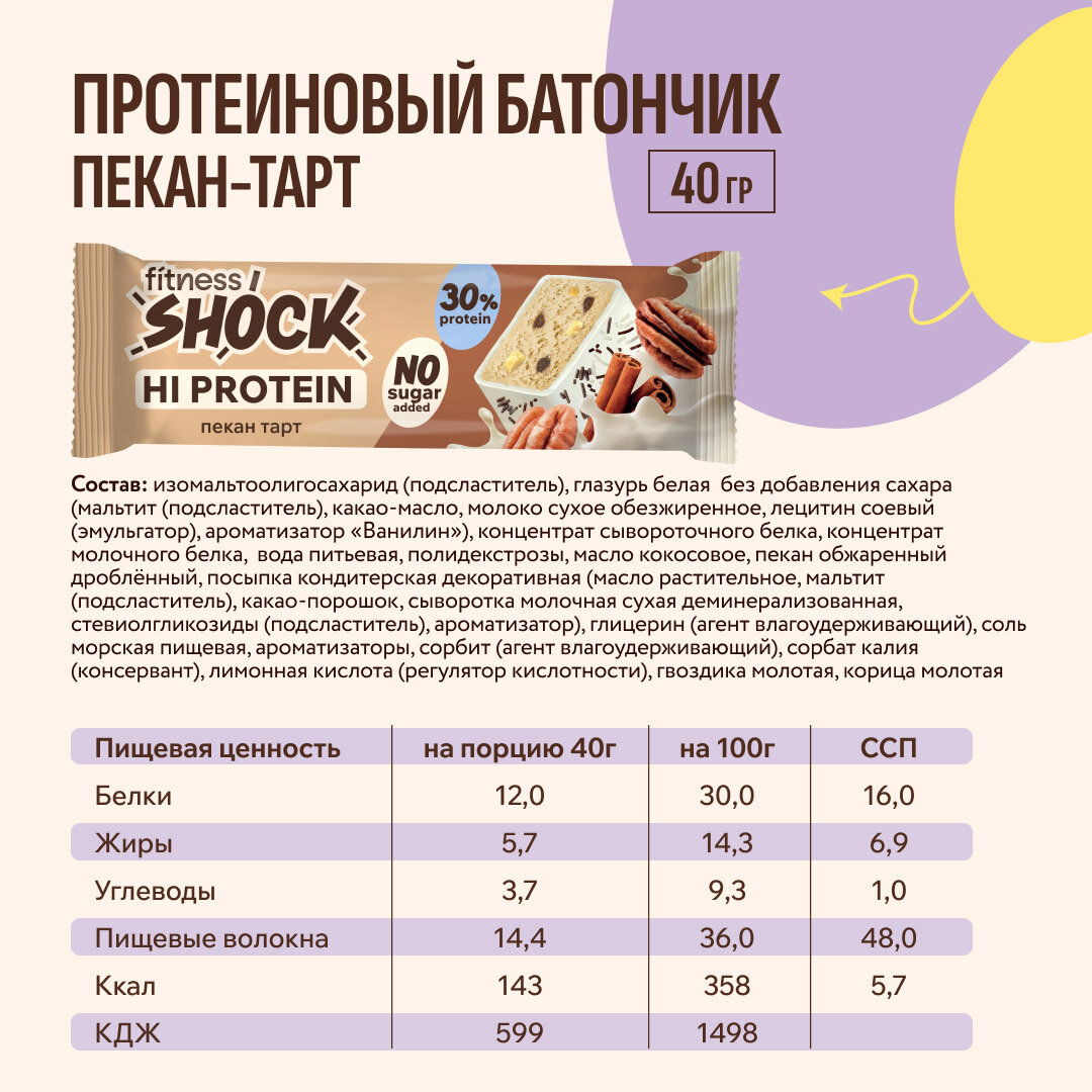 Протеиновые батончики без сахара FitnesSHOCK "Пекан-тарт" 40 гр 12 шт информация: