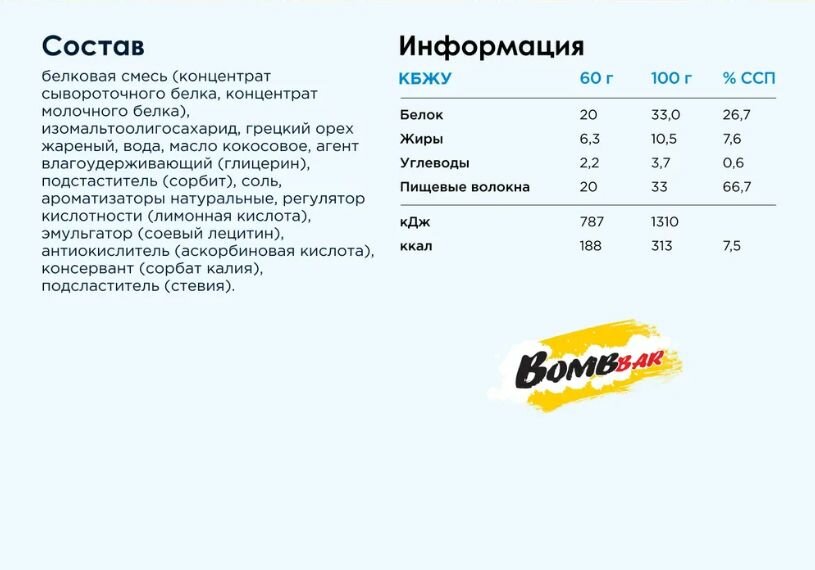 Мы выбрали 10 лучших цен на BombBar протеиновый батончик 60 г, 20шт (Грецкие орехи с медом). Перед тем как купить BombBar протеиновый батончик 60 г, 20шт (Грецкие орехи с медом) посмотрите найденные предложения из Яндекс Маркета и других сайтов на основе XML фидов.