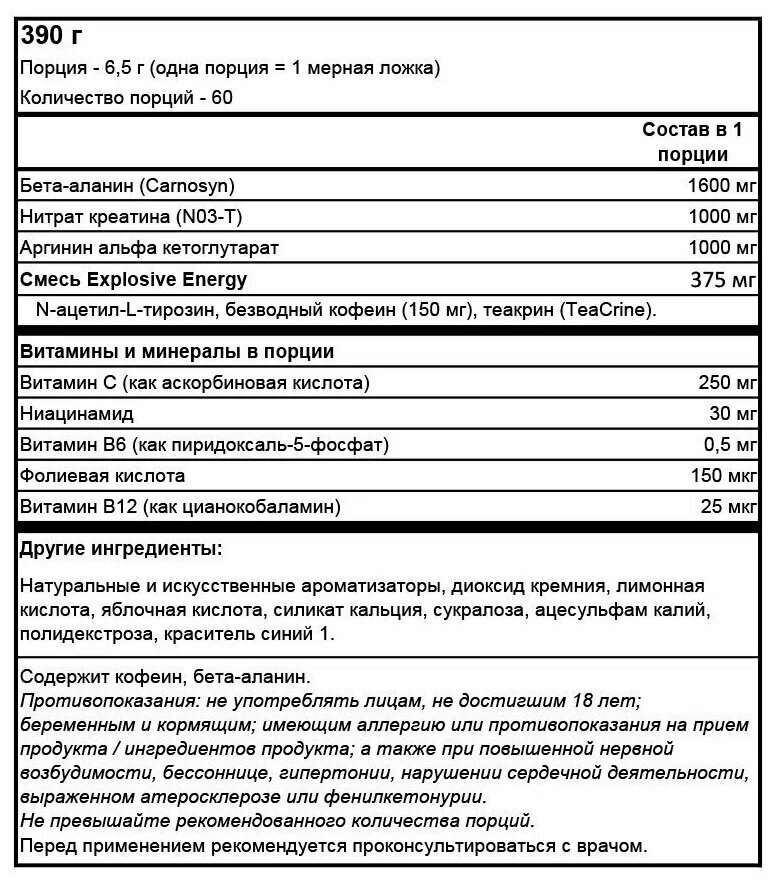 | Основные ингредиенты | BCAA / аргинин / бета-аланин / витамины и минералы / кофеин / креатин |