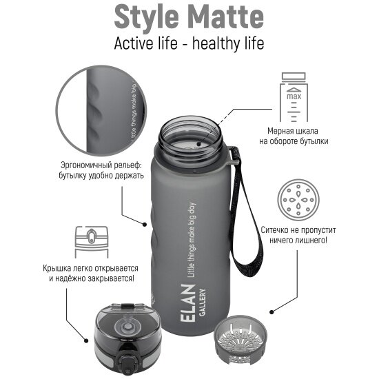 Бутылка для воды Elan Gallery Style Matte, с углублениями для пальцев, серая, 500 мл информация: