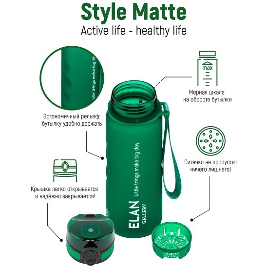 Бутылка для воды Elan Gallery Style Matte, с углублениями для пальцев, темно-зеленая, 500 мл информация: