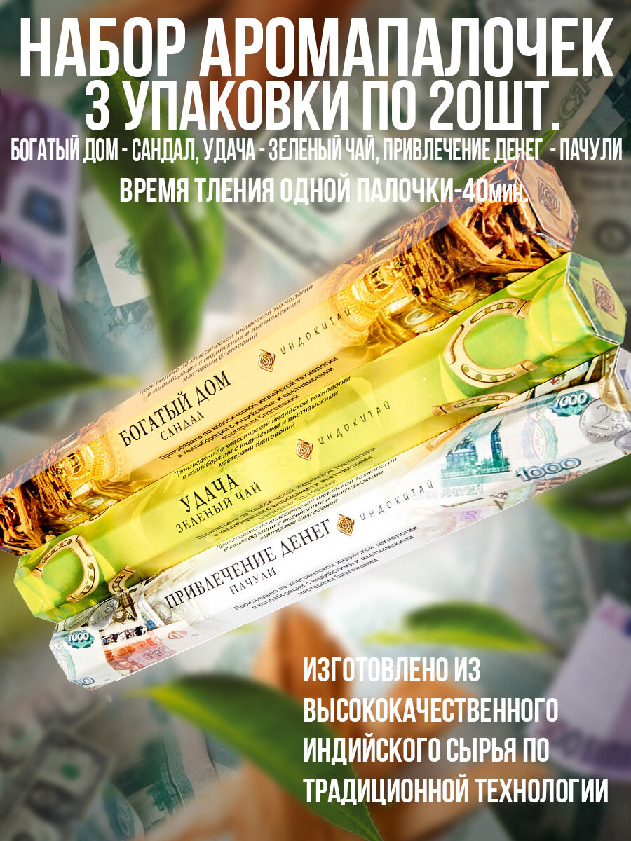 10 цен на Благовония, Ароматические палочки, Набор аромапалочек "Индокитай"3упак по 20шт: Пачули, Сандал, Зеленый чай