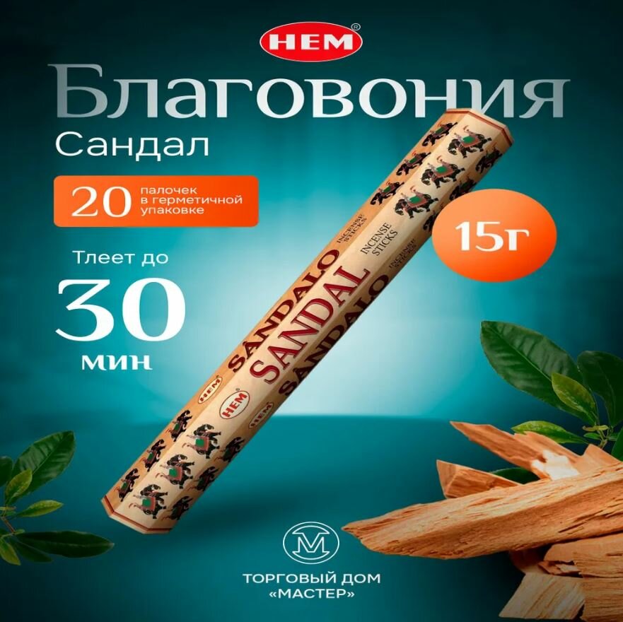 Благовония HEM "Sandal", сандал, для медитации и ароматерапии, 20 палочек информация: