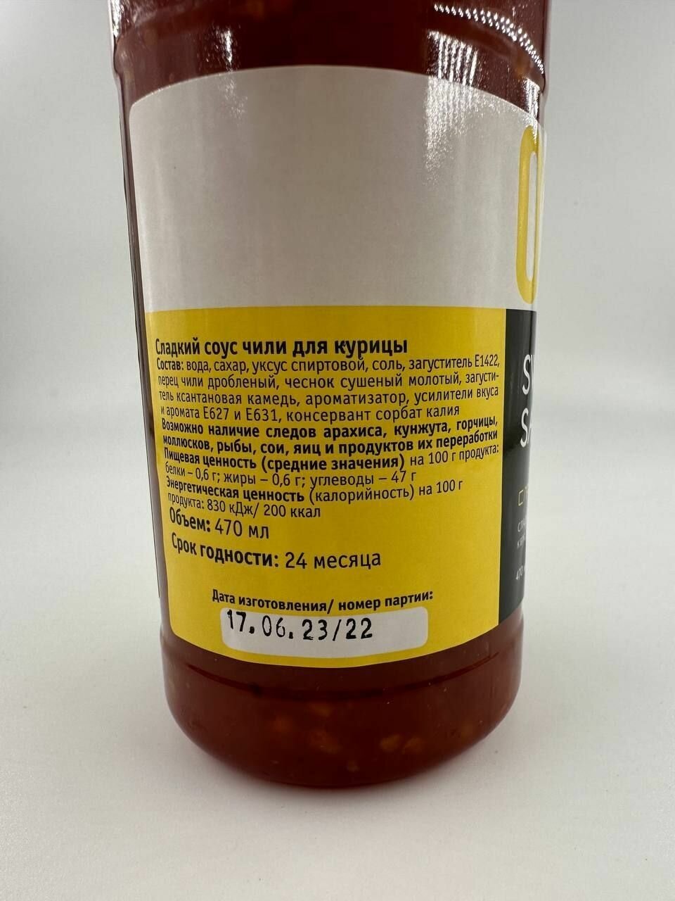 | Состав | вода, сахар, чеснок, уксус спиртовой, соль, перец чили, загустители: Е1422 и ксантановая камедь, усилитель вкуса и аромата Е627, консервант сорбат калия. |