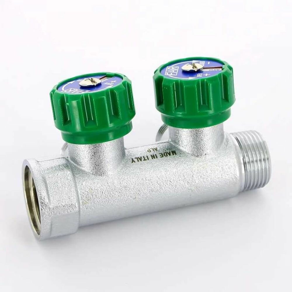 Коллектор регулирующий проходной FAR Multifar размером 3/4", кол-во отводов 2 шт., резьба на отводах 1/2" под плоскую прокладку 3 985 ₽