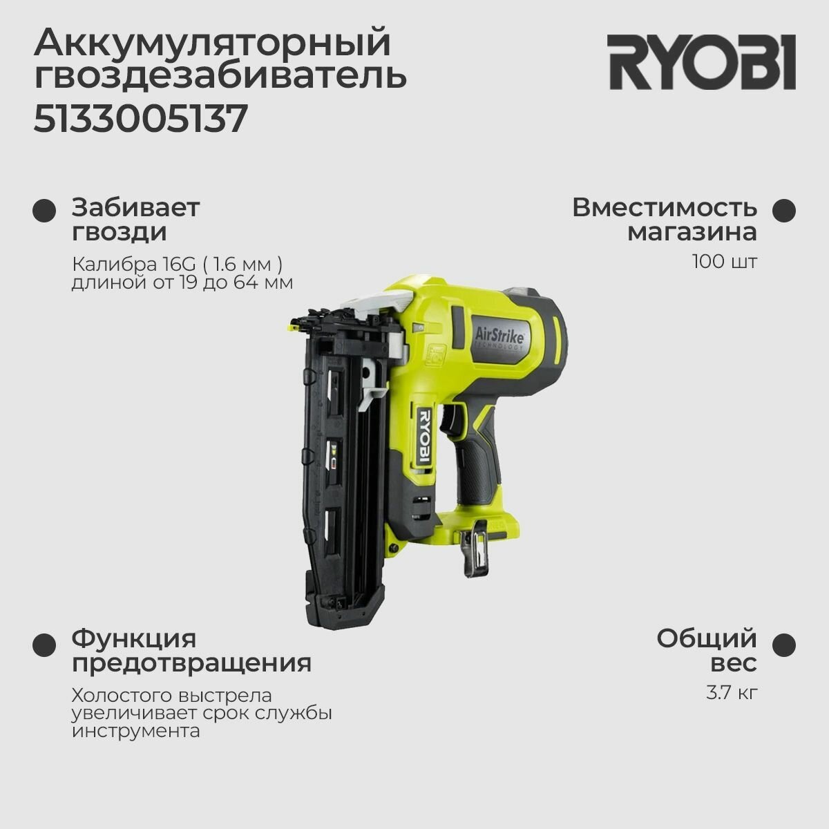 Гвоздезабиватель Ryobi R16GN18-0 ONE+ 5133005137 информация: